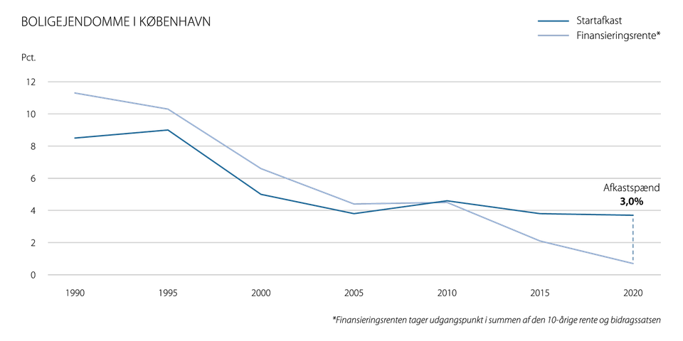 Det skyldes ikke mindst udviklingen på lånemarkedet over de seneste år, hvor renterne er dykket markant med den konsekvens, at det positive spænd mellem lånerenten og det rene driftsafkast fra ejendomme ligger på et af de højeste niveauer, vi har set over de seneste 30 år.