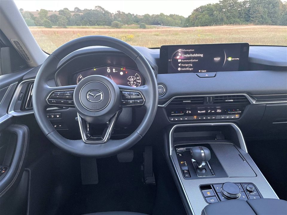 CX-60 er bygget på en ny platform, der også bruges til den større CX-80, som kommer til næste år med syv sæder. Men her er allerede masser af plads mellem akslerne og i bredden. Tyngden mærkes også bag rattet, hvor du har udsigt til et klassisk instrumenthus med fuld digital opløsning i lækkert layout, mens en kæmpe skærm på 12,3 tommer dominerer i midten.
