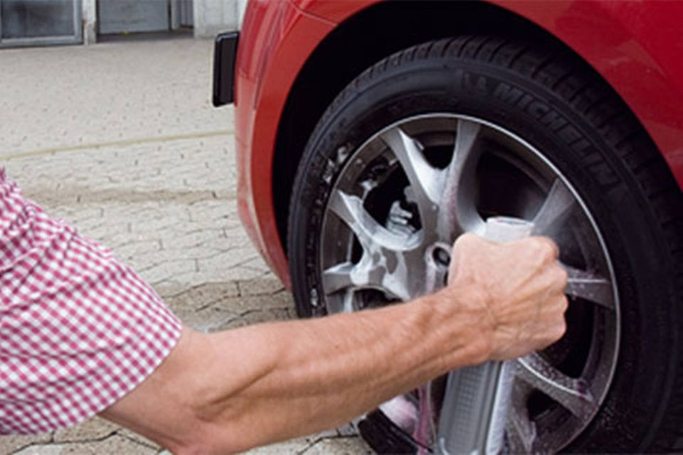 Giv fælgene et par sprøjt med et rensemiddel og spul skidtet væk.