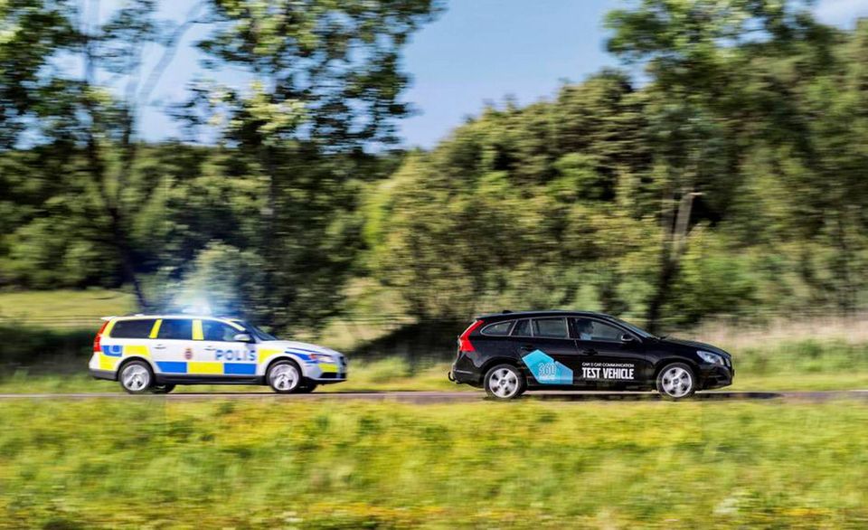 I instrumentpanelet blinker en lampe, der signalerer, hvor udrykningskøretøjet kommer fra, og sekunder senere kommer en ægte svensk politibil drønende forbi. Systemet er også i stand til at advare dig, hvis biler længere fremme på vejen enten stopper og sætter advarselsblinket til, eller oplever et sving, hvor vejen er glat.