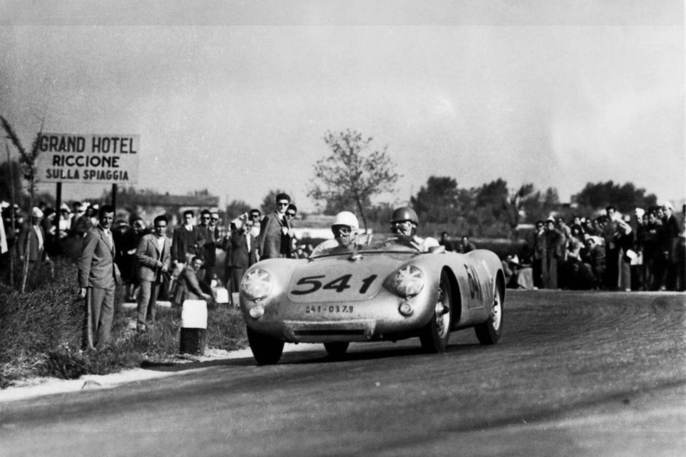 Kort tid forinden var den unge blonde skuespiller med den evige Chesterfield-cigaret i mundvigen rullet op foran bilforhandleren på North Vine Street i Hollywood. Dean havde netop afsluttet optagelserne til filmen ”Giganten”, og den 24-årige skuespiller, som allerede var en superstjerne, glædede sig nu til at få byttet sin seks måneder gamle Porsche 356 Super Speedster med den nye model. Den åbne topersoners sportsvogn var netop kommet fra hovedimportøren Max Hoffmann i New York, og den racingglade rebel så frem til at få prøvet kræfterne af ved et løb i Salinas 350 miles nord for Los Angeles.