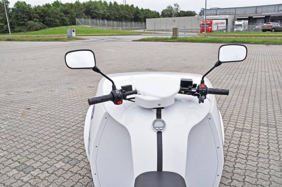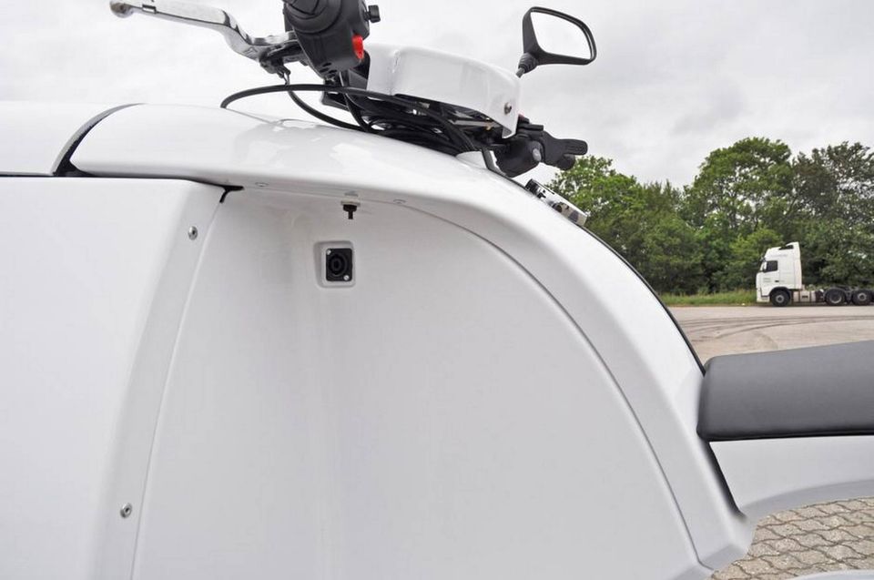 Den ligner en gammeldags budcykel, og jeg føler mig næsten også hensat til en sådan, da jeg sætter mig bag styret af den aflange scootersaddel og skuer ud over den lange glasfibersnude af en transportkasse.