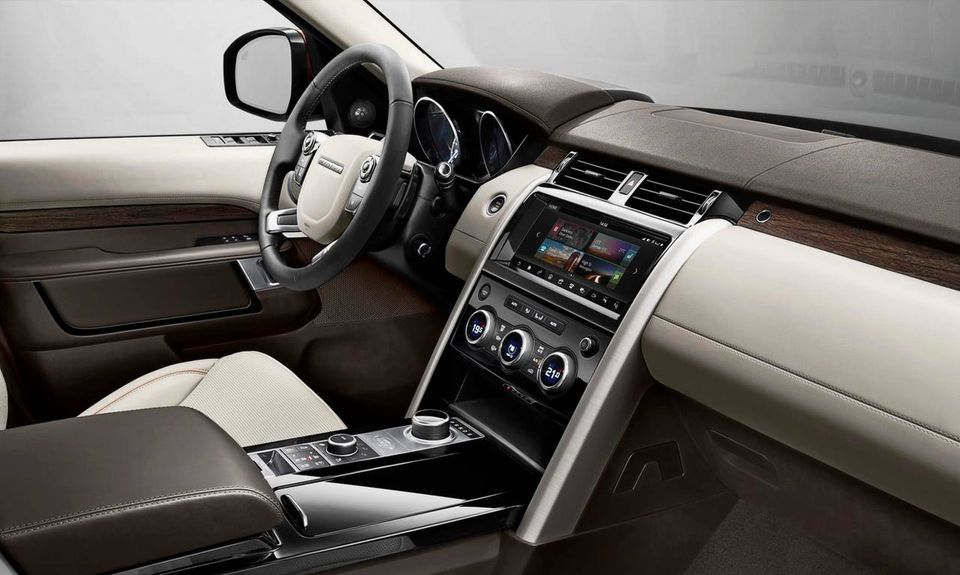 Interiøret er i den nye, enkle Land Rover-stil. En stor del af betjeningen foregår med en 10 tommers-berøringsskærm.