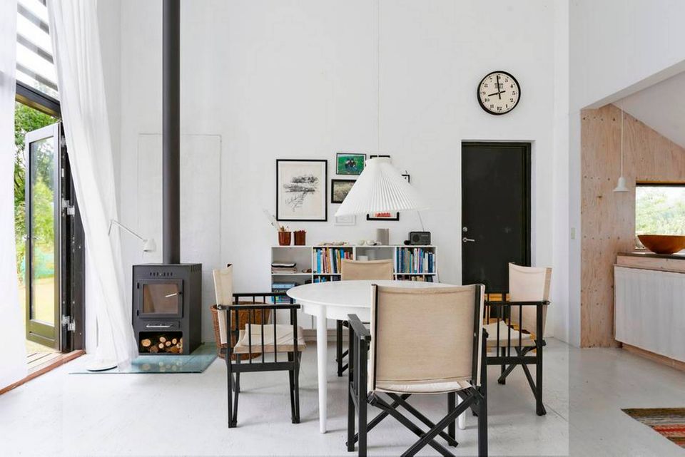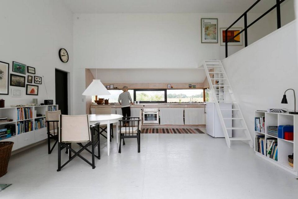 »Den grundlæggende tanke bag huset var, at det lå på en naturgrund – ikke en sommerhusgrund. Huset skulle falde ind i omgivelserne, og samtidig ville vi også have naturen med indefra. Derfor blev det til de store vinduer, som vender ud til vand og mark. Der er ikke noget fjernsyn i huset, og det er bevidst. I stedet for sidder jeg og kigger ud over marken og vandet,« siger hun.
