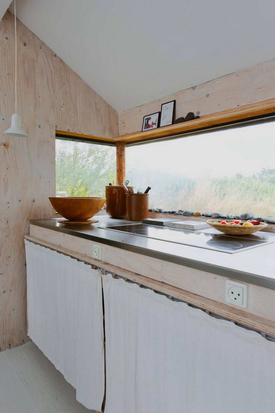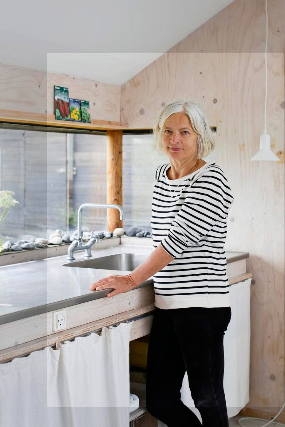 Også indvendigt viser det sig, at Dorthe Jørgensen har en svaghed for naturen. I vindueskarmen i køkkenet, på reolen i stuen og på udvalgte pladser på husets udvendige side ligger der rå strandsten i forskellige farver og former. Samlet igennem ti år og brugt i indretningen som en måde at få naturen hele vejen ind i boligen. Den rå indretningsstil finder man flere steder i huset. Som stuegulvet i krydsfinér, der går igen i køkkenets vægge. Og udvendigt er huset foruden sorte træpaneler også beklædt i grov tagpap.