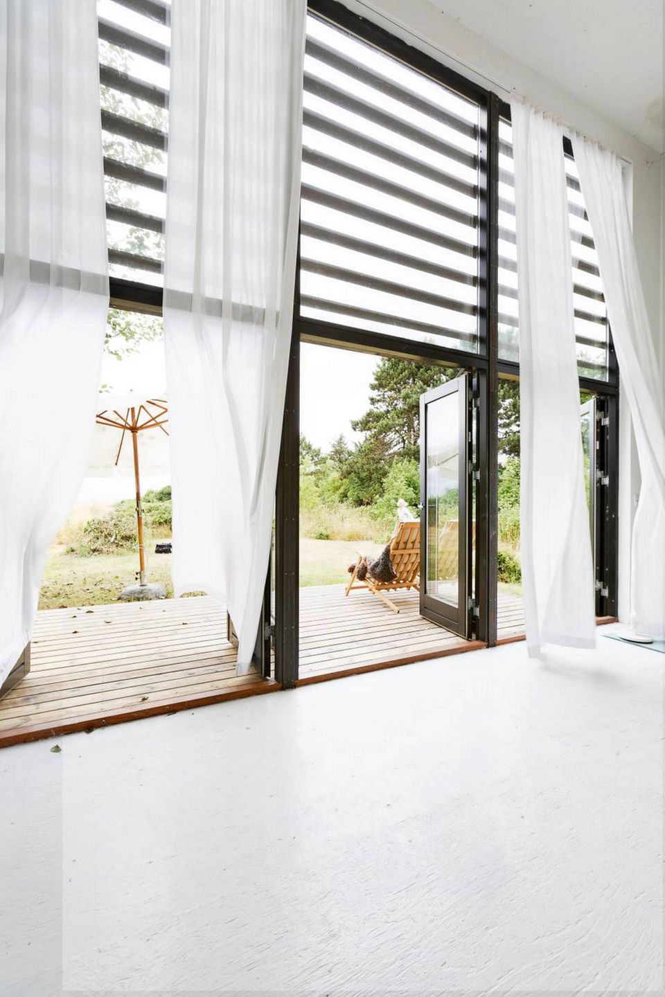 Både vand, vind og luft har været i spil i udformningen af huset. Med mindre end fem minutters gang til havet er vandet lige inden for rækkevidde, og de store glaspartier i stuen sørger for, at luften kan suse ind og lege med de store hvide gardiner. Og et 180-graders kig igennem huset gør det muligt at se by og vand samtidig.