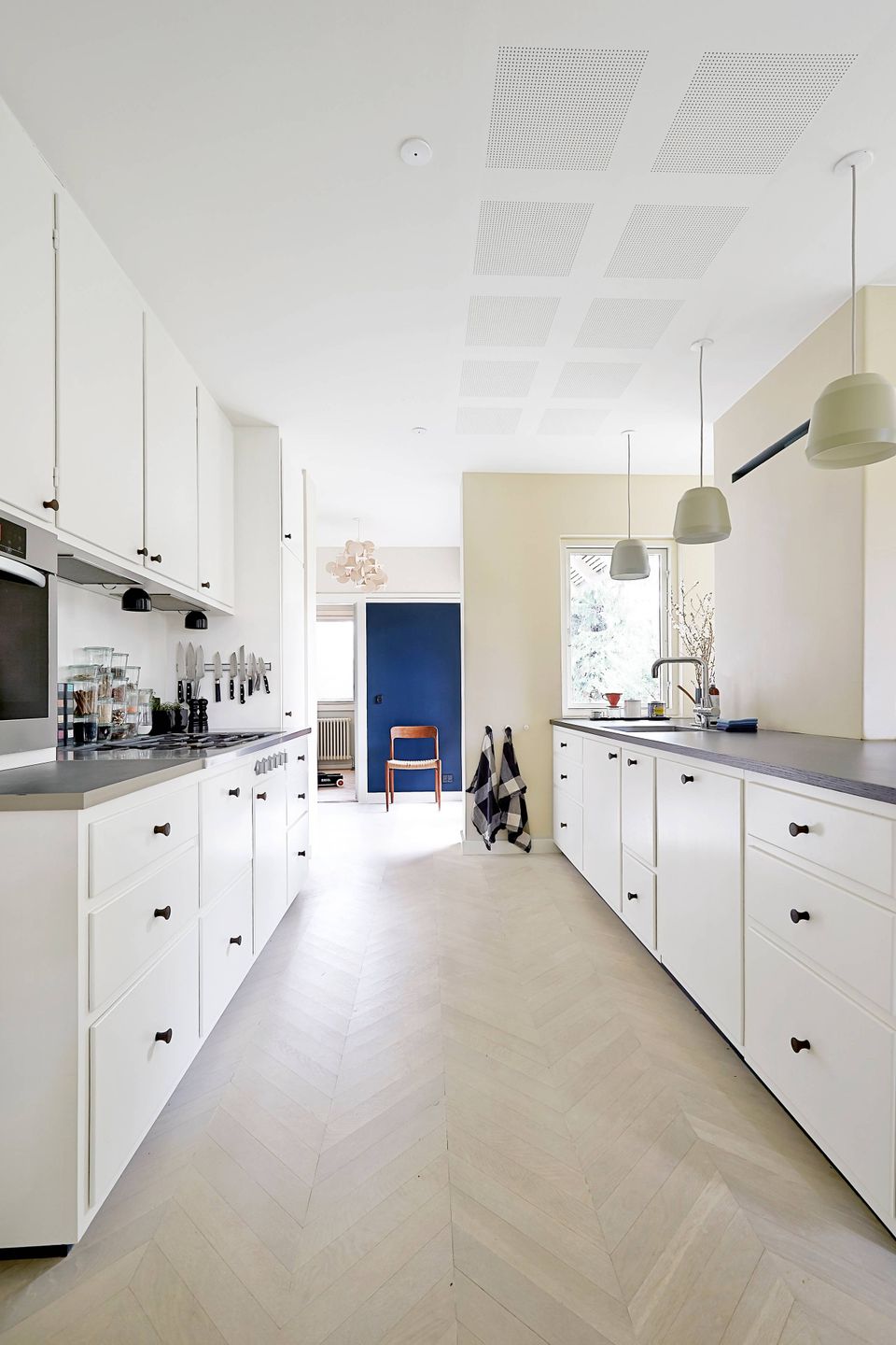- Væggens farve er inspireret af tegltagene på andelsboligerne på den anden side af vejen, for når man skal finde en farve til et rum er det altid en god idé at kigge ud af vinduet og se på farverne udenfor. På den måde skaber man en tæt forbindelse mellem ude og inde, fortæller Anders Barslund.