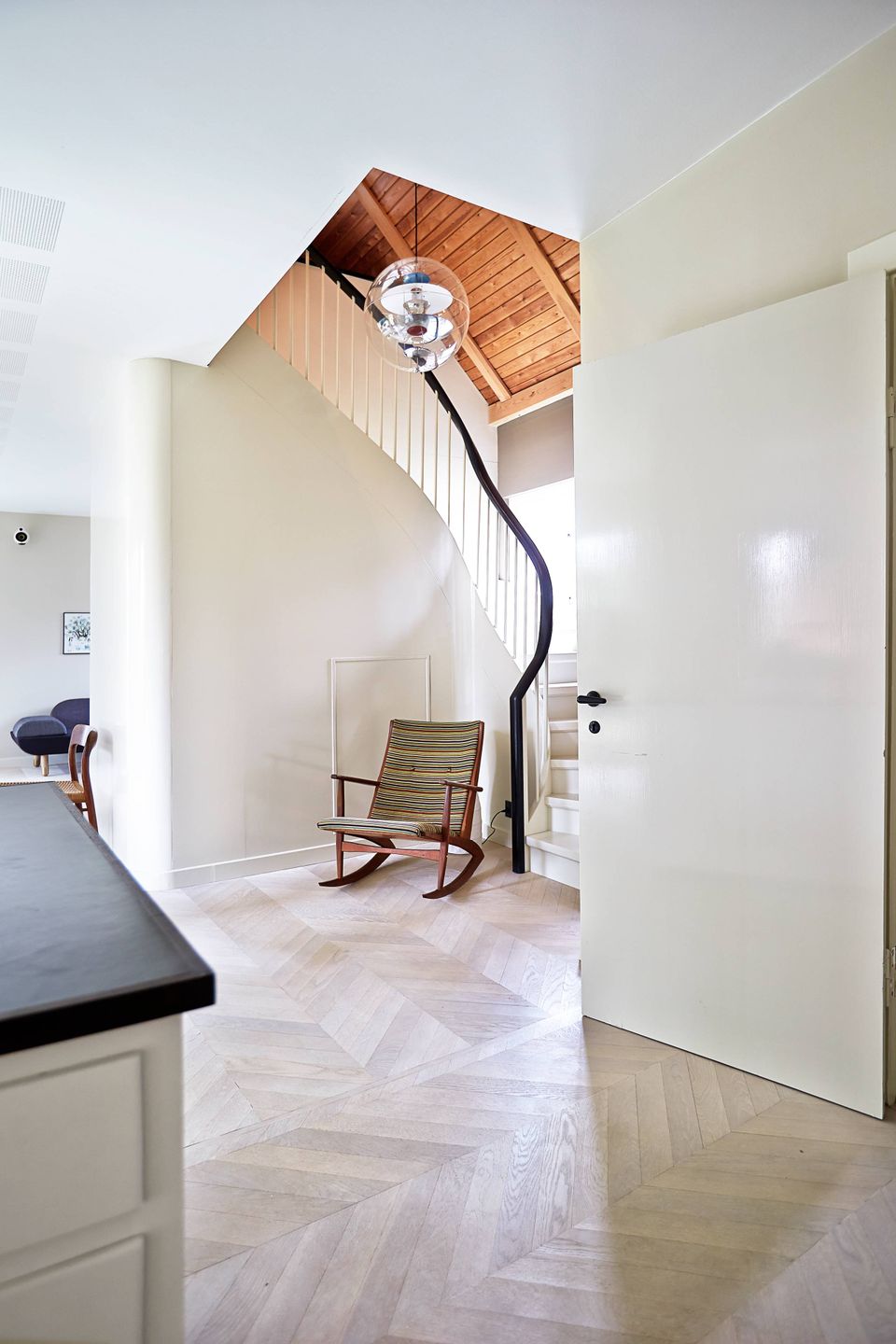 - Brug meget mørke farver, hvor noget skal træde i baggrunden – fx en mørk radiator under vinduet og den ene væg på trappe-reposen i dette hus.