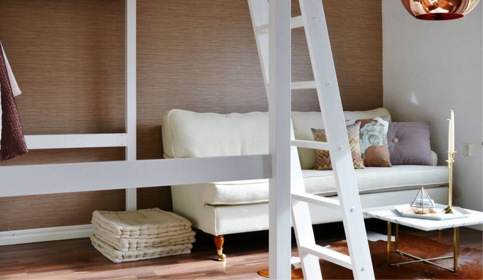 Felicia Marthe har da også udnyttet den trange plads til UG. Blandt andet har hun hævet sengen og brugt pladsen under til opbevaring. Ved siden af har hun indrettet et lille hyggeligt sofahjørne, ligesom hun ved køkkenafdelingen har fundet plads til et lille højt spisebord med plads til to.