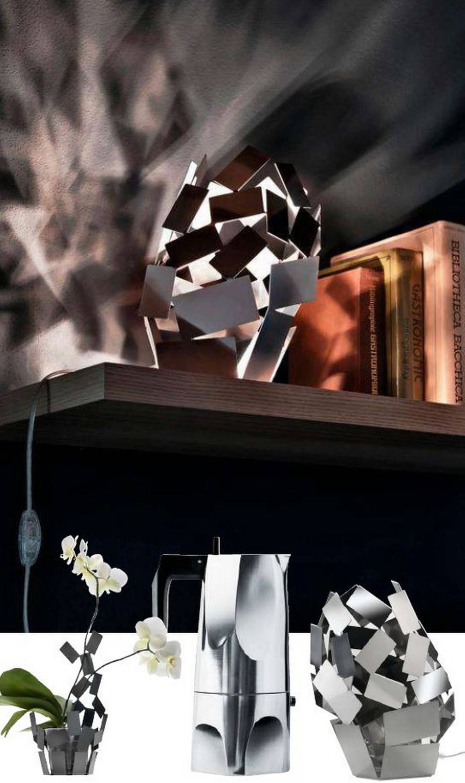 Mario Trimarchi er særligt betaget af skygger. Han har designet en frugtskål, som i virkeligheden ikke er tænkt til nødvendigvis at indeholde frugten. I stedet er der plads til, at frugten kan placeres under skålen, som står på ben. På den måde opbevarer man frugten i skygge, så den holder længere. Det er en alternativ måde at tænke design på, hvor skyggen er et rum i sig selv. Det samme gælder hans design ”La Stanza Della Scirocco”. Det kaster en smuk skygge afhængigt af belysningen, og fordi skyggen er et mønster i sig selv, som bliver kastet på bordpladen, bliver det til et rum.