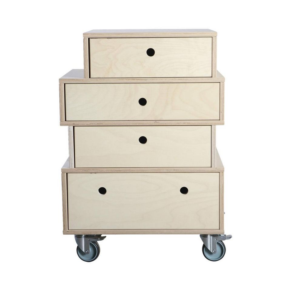 Den skæve, men enkle kommode af lys birkefinér fra House Doctor er både sjov og praktisk. Ikke bare kan møblet anvendes som kommode, men også som et forfriskende indslag i stuen i form af et sofabord, som er rigt på opbevaringsplads. Kommoden Mix er en del af en hel serie med forskudte former. Pris: 3.899 kr.