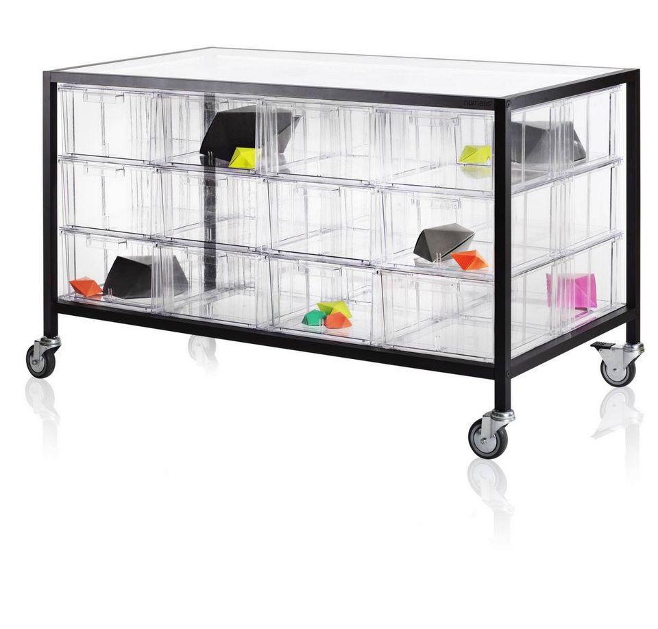 Der er skruet op for både design og praktik med Nomess Copenhagens møbel Clear Drawer. Det kvadratiske møbel kan fungere som skænk eller kommode, men også bruges som et praktisk møbel i køkkenet eller på badeværelset – og så har det hjul. Der er i alt 24 skuffer i gennemsigtig akryl, og det skaber et hurtigt overblik. Pris: 24.995 kr.