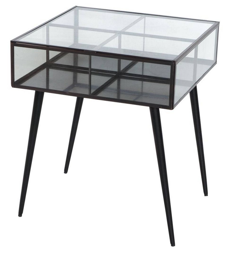 Hvorfor ikke give sofabordet en ekstra dimension ved at skabe opbevaringsplads under bordpladen – og så ovenikøbet på en dekorativ måde? Det smarte bord af glas og aluminium fra Au Maison er rummeligt med sine fire små rum til enten pyntegenstande eller ting, der er rare at have lige ved hånden i stuen. Pris: 1.999 kr.