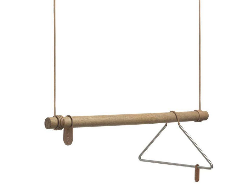 Når pladsen er begrænset, hvorfor så ikke udnytte loftet? Det aarhusianske designfirma Lind DNA har kreeret det fine, bæredygtige tøjstativ Swing, som sættes op i loftet ved hjælp af dekorative lædersnore af genbrugslæder. Snorene kan justeres i højden. Det minimalistiske tøjstativ fås i tre farver: Oak black, Oak nature og Oak brown. Pris: fra 1.500 kr.
