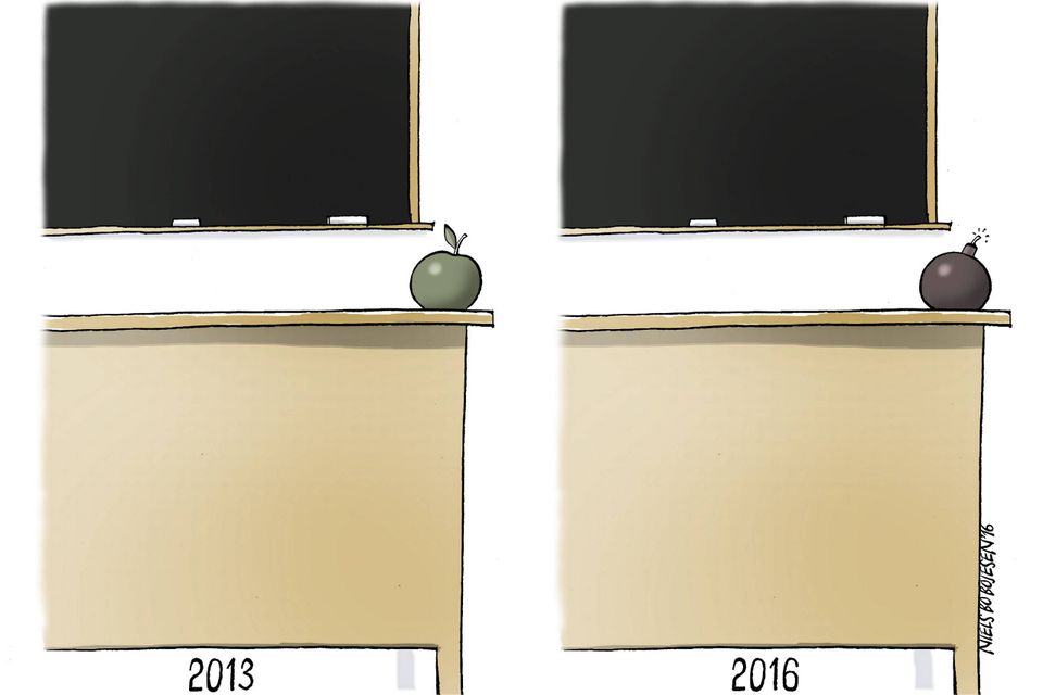 Jyllands-Posten har kørt en artikelserie om vold og trusler mod lærere i folkeskolen. Ifølge en undersøgelse fra Det Nationale Forskningscenter for Arbejdsmiljø har hele 45 pct. af alle lærere og pædagoger oplevet vold eller trusler inden for det seneste år – primært fra elever i de helt små klasser.