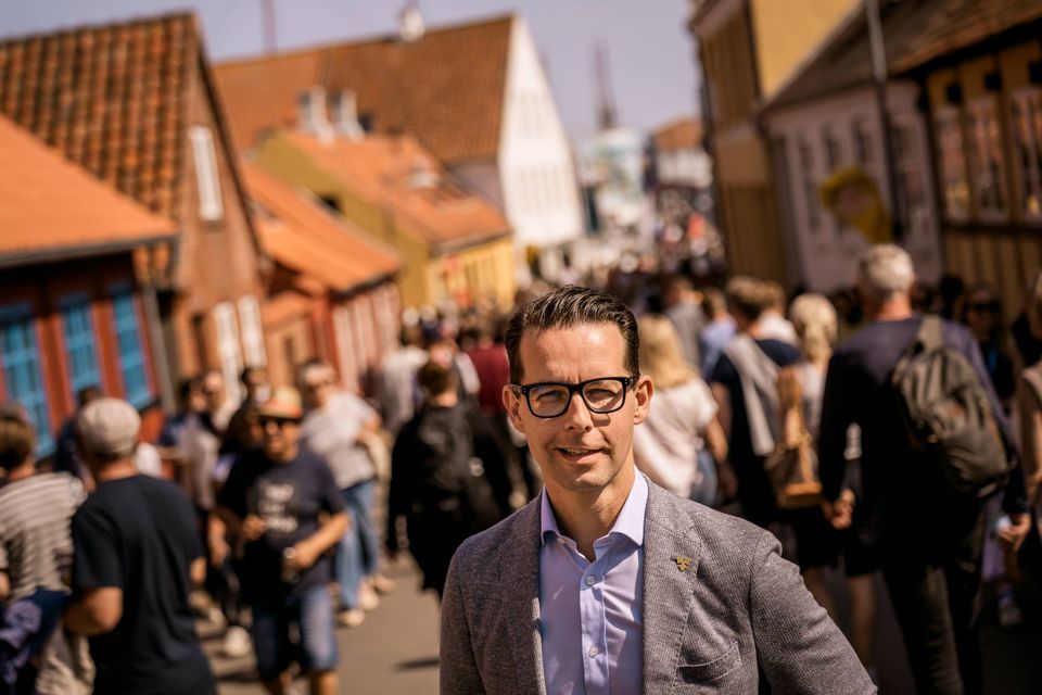 Jacob Aarup-Andersen kan ikke holde smilet tilbage, da han sidder i lyseblå skjorte og tager en tår af det festivalagtige ølkrus.