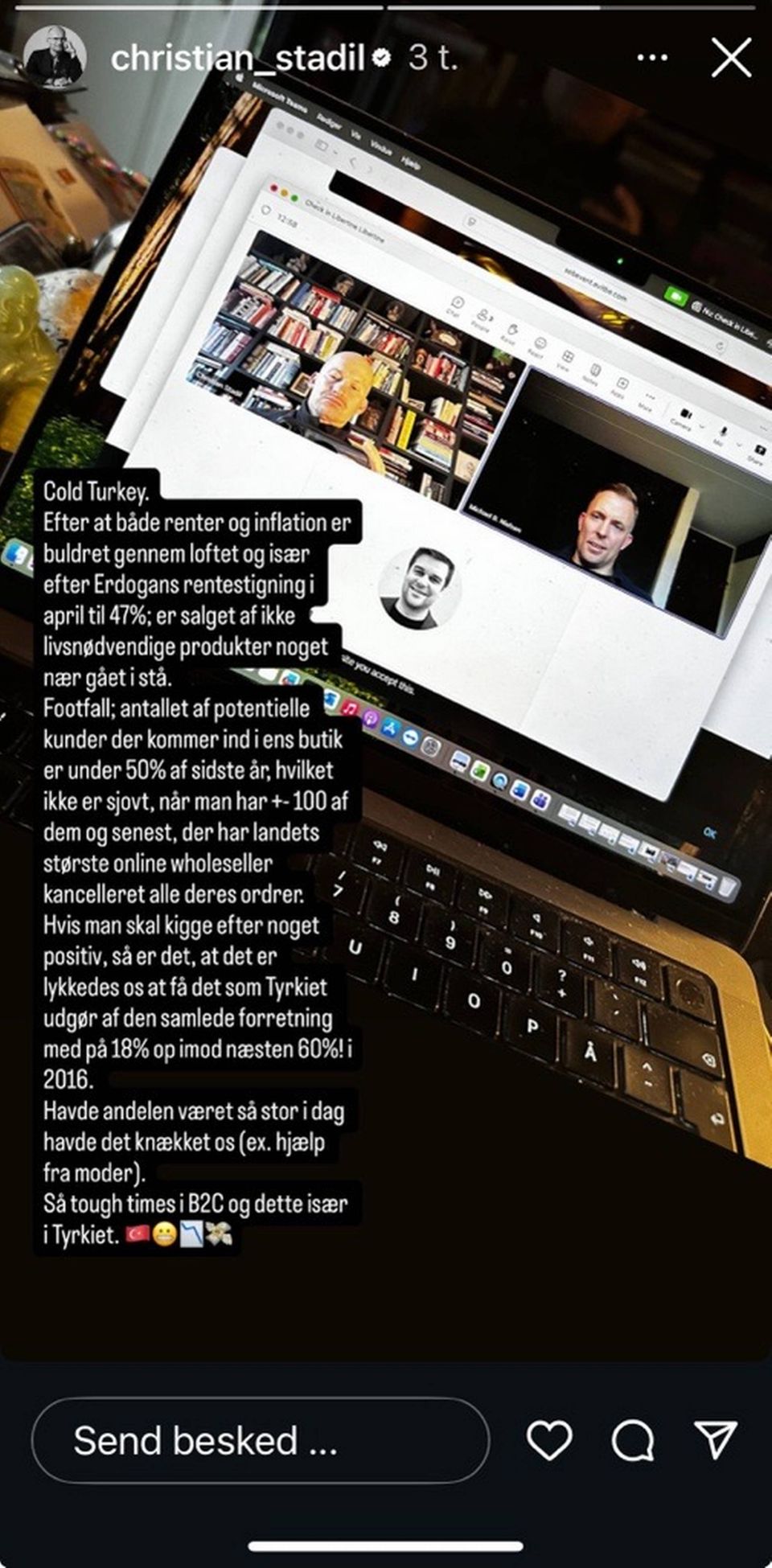 »Trods der er udfordringer i den samlede detailhandel i bl.a. Tyskland og andre steder i Europa, har vi fremgang i forretningen og ser positivt på udsigterne, når vi altså ser ud over Tyrkiet. Desværre kan det, som vi taber på det store marked aktuelt, ikke indhentes af resten,« siger Lars Stentebjerg, uden at ville præcisere tallene yderligere før årsregnskabet er afsluttet.