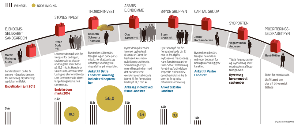 Domme: Foreløbigt er der idømt fængselsstraffe på 58 år, bøder for 99 mio. kr. og konfiskation af værdier for 48 mio. kr. Hovedparten af dommene er anket. Men for Martin Malvang Klüts samt Steen Gude og hans kolleger omkring Stones Invest er dommene endelige.