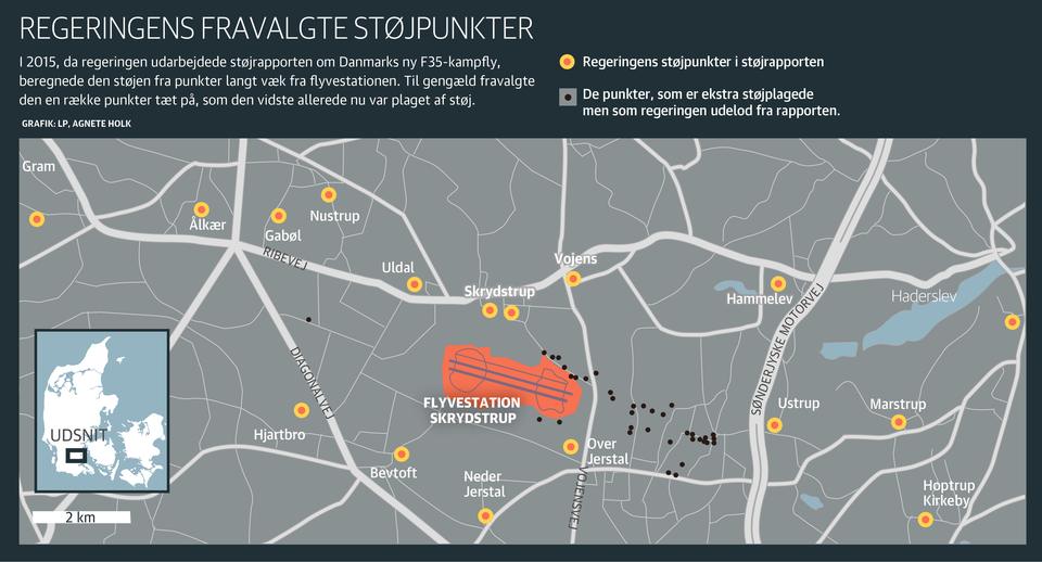 Da regeringen i 2015 skulle beregne støjen fra Danmarks nye F-35-kampfly, undgik den behændigt de mest udsatte, støjplagede steder i Sønderjylland. Det viser en gennemgang af sagen, som Jyllands-Posten har foretaget.