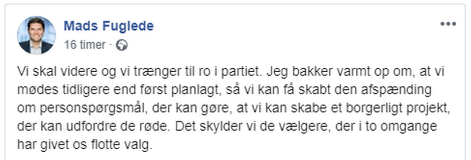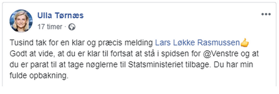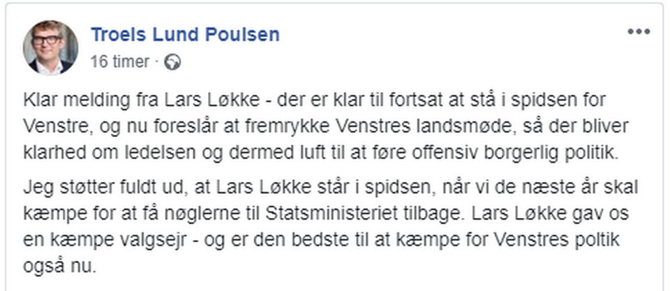 Også Troels Lund Poulsen og Ulla Tørnæs støtter i et opslag på Facebook Lars Løkke Rasmussen som fortsat formand i partiet.