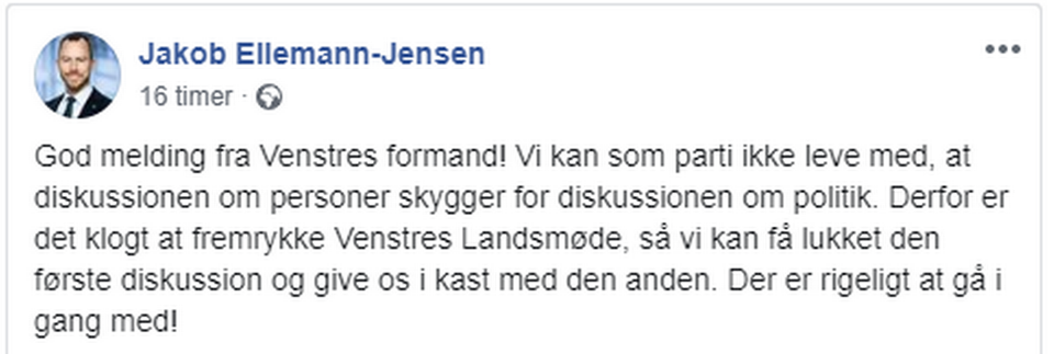 En af støtterne er Jakob Ellemann-Jensen, der bliver nævnt som en mulig ny formand, hvis de dele af V-baglandet, som ønsker både Lars Løkke Rasmussen og Kristian Jensen afsat, får deres vilje. På Facebook skriver han således: