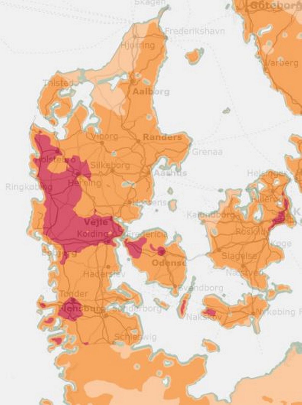 Derudover befinder det vestlige Fyn, Odense, Langeland, Vestlolland og en del af Region Hovedstaden sig også i den brandfarlige kategori.