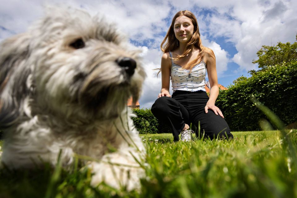 Den etårige havaneser Leah spurter hen til havelågen, da Julie Slyngborg åbner den. Hunden springer begejstret op ad hendes ben, et øjeblik er den foran, så bag, så foran igen – og den 15-årige pige griner.