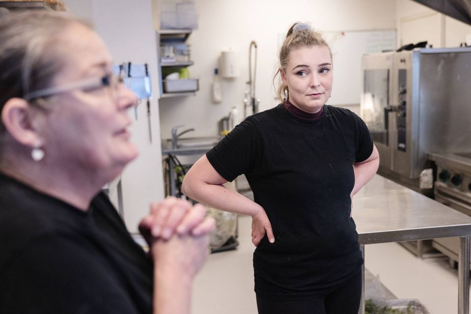 Sammen med sin datter er hun rykket ud i solen foran deres arbejdsplads, smørrebrødsforretningen Hos Jomfruen midt i Korsør. Lige over for kirken, hvor Emilie Meng blev begravet fra.