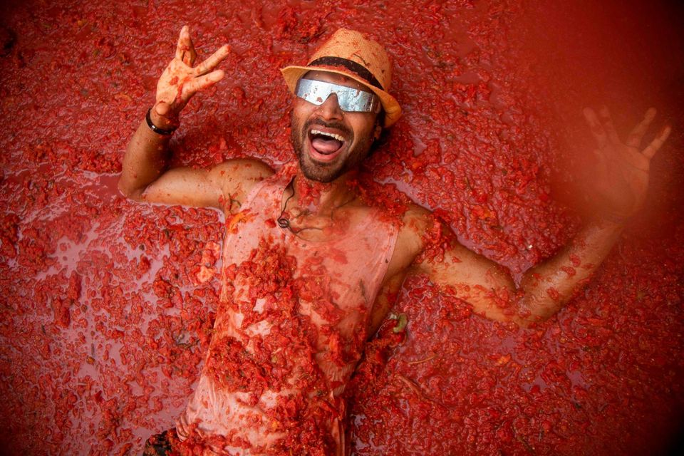 Onsdag den 30.august - Madkamp på den årlige tomatfestival Tomatina i Bunol i Spanien. Traditionen tro samles de 15.000 deltagere og kaster 120 tons tomater efter hinanden i en gigantisk tomat-gadekamp. Foto: Jose Miguel Fernandez/AFP
