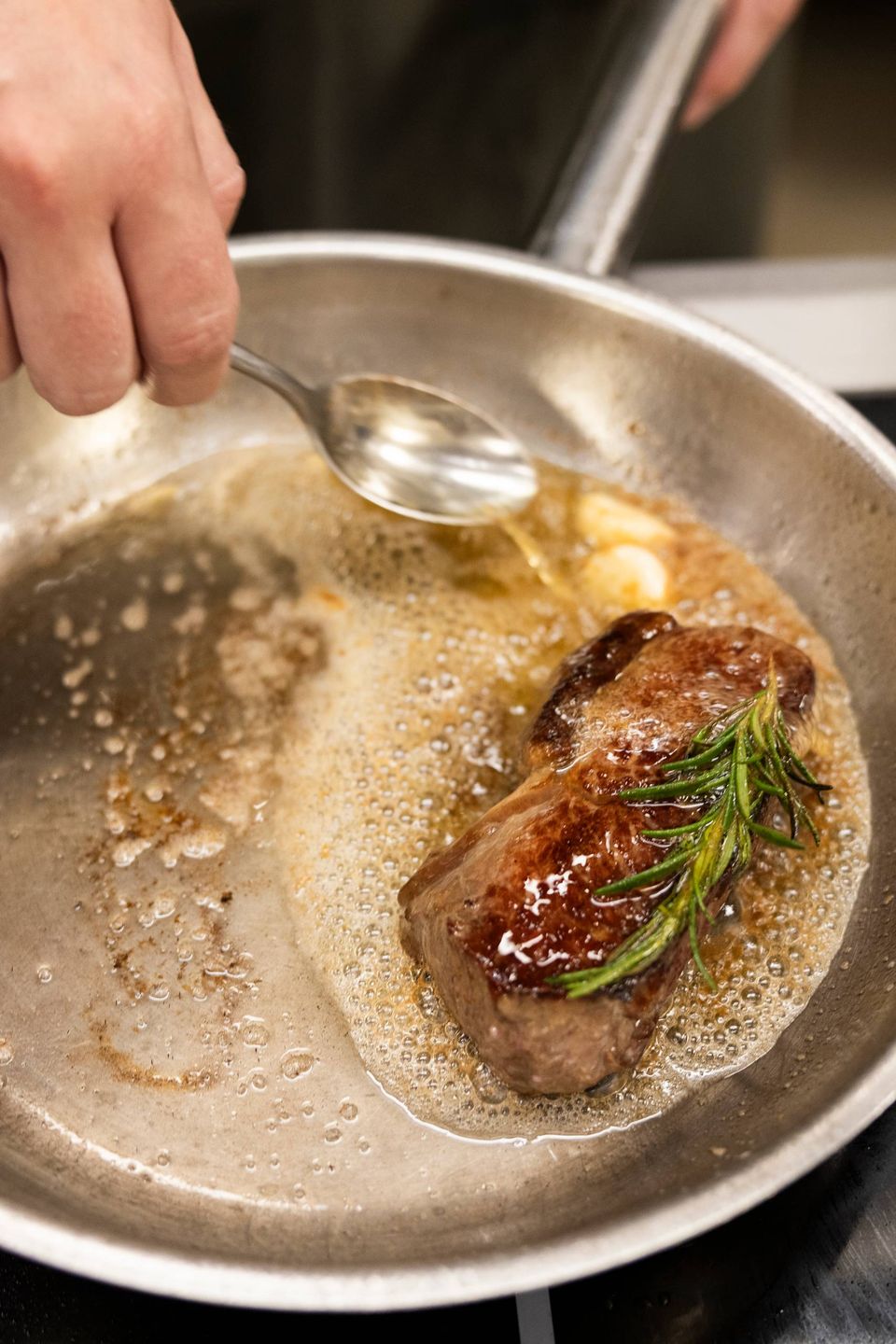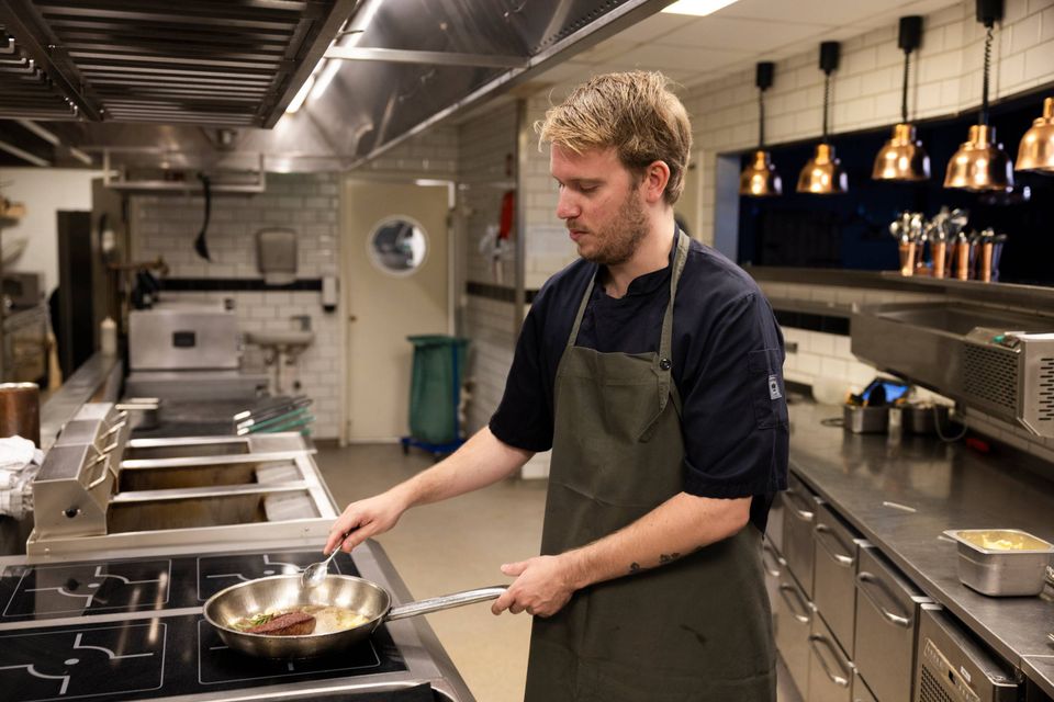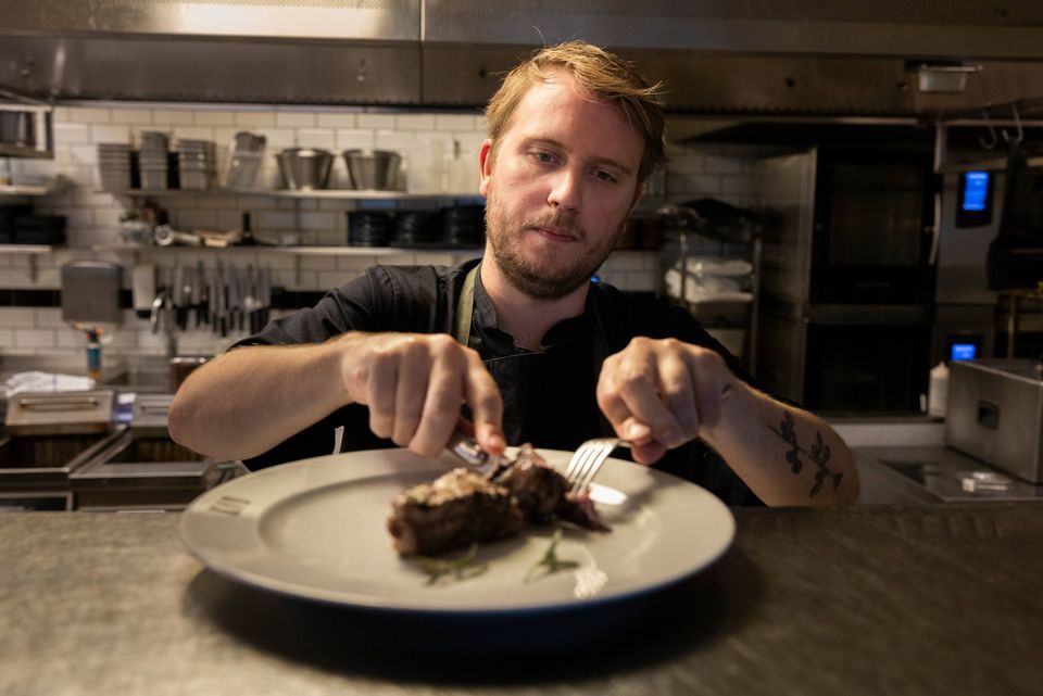 Mathias Tackmann steger den ene bøf i hver pakke på en pande og den anden på en indendørs grill i restaurantens køkken.