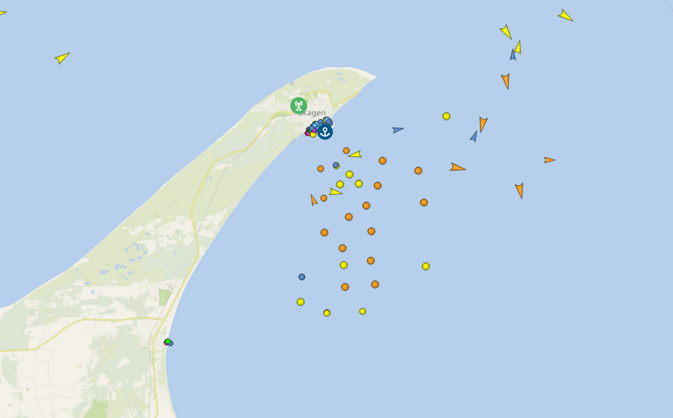 I skrivende stund benytter mindst 25 skibe ankerpladsen, viser positionsdata fra Vesselfinder.com.