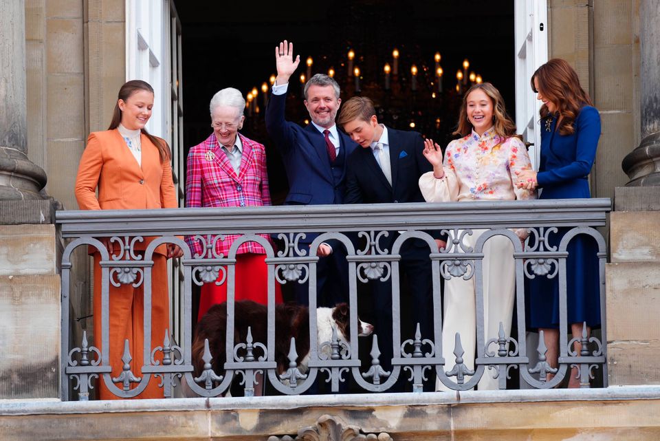 Kong Frederik var omgivet af sin familie på balkonen på Frederik VIII’s Palæ mandag middag, da han trådte ud for at vinke til de fremmødte på sin fødselsdag.