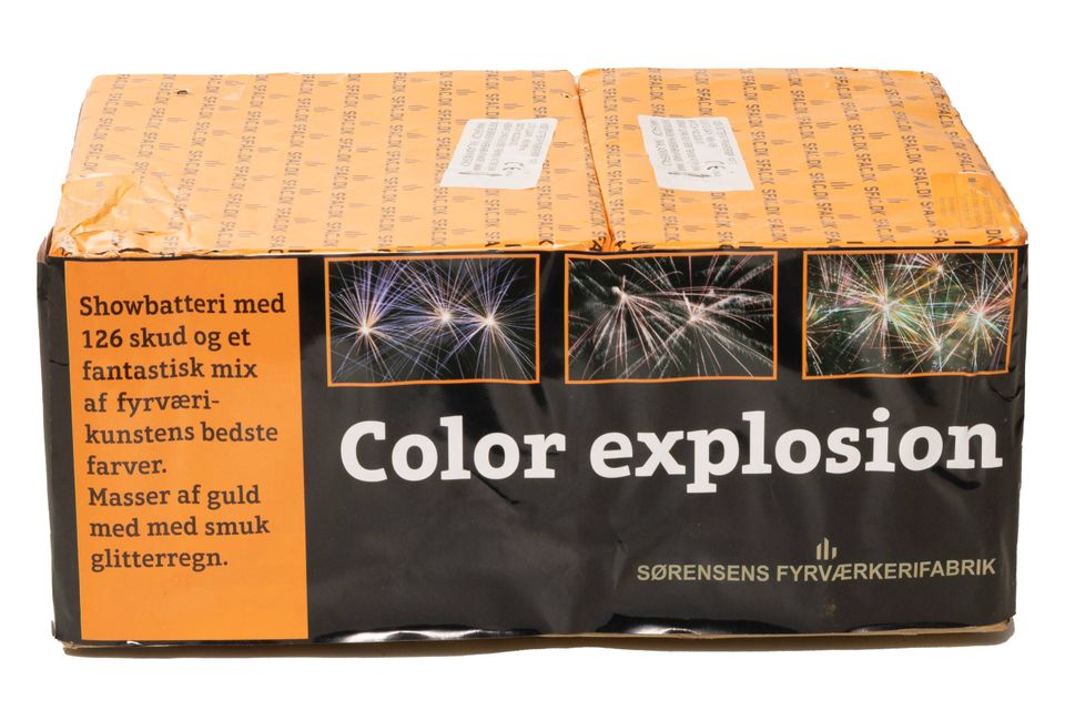Kommentar: Rigtig mange skud og lang varighed, så man får meget for pengene. Men effekterne er meget kortvarige – man kan næsten ikke nå at se farverne, før de er brændt ud.