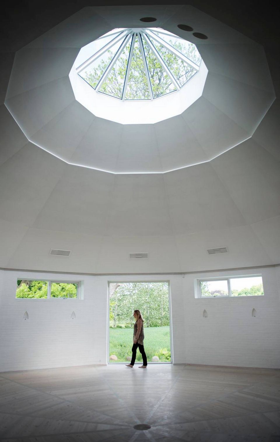 Ind i salen træder tre buddhistiske munke i bare fødder og farvestrålende gevandter, efterfulgt af en kvinde med langt, lyst hår. De fire indtager tavse deres pladser langs den ene væg i det tolvkantede rum. Al lyd forstummer. Energierne forenes. Meditationen begynder.