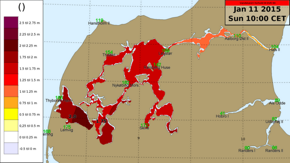 Tidligere har vandet nået op på 1,81 meter over dagligt vande, men søndag formiddag målte DMI som nævnt en officiel vandstand på 1,95 meter. Det førte til evakuering af beboerne i ca. 50 husstande i kommunen.