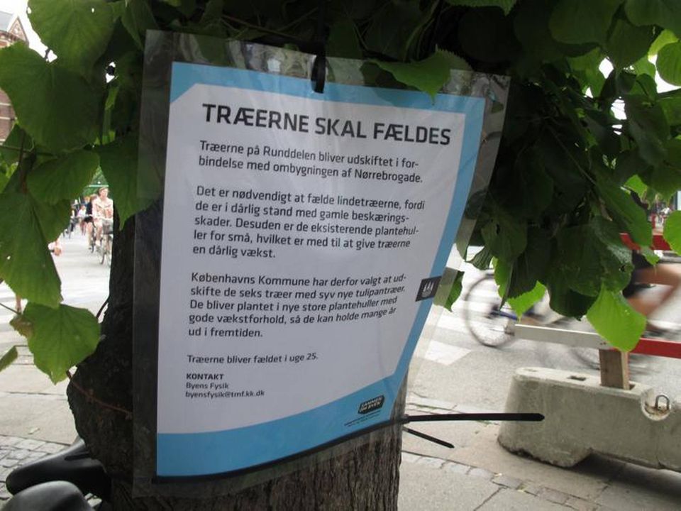 Det er beskeden på de sedler, som Københavns Kommunes afdeling Byens Fysik har sat op på seks store lindetræer på Nørrebros Runddel.