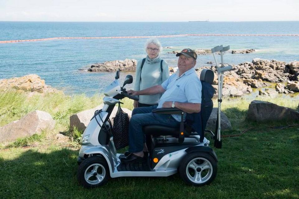 Med store, glade grin præsterer ægteparret Eli og Ejler Mogensen fra Frederiksberg sig selv i en pause på Folkemødet på Bornholm. Tæt på hovedscenen og med et postkort af en udsigt over Østersøen lige i ryggen.