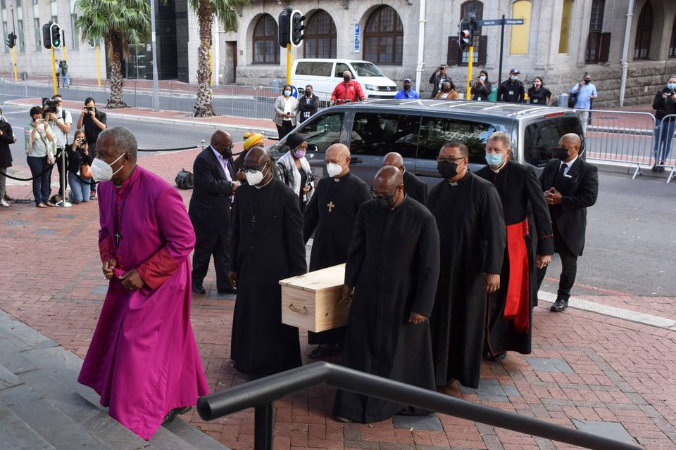 En fyrretræskiste med den afdøde tidligere ærkebiskop Desmond Tutu er ankommet til en katedral i Cape Town.