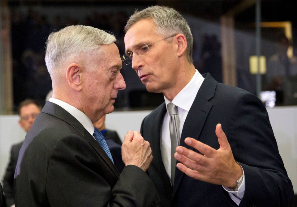 Jim Mattis og Nato's generalsekretær Jens Stoltenberg ved det store Nato-møde i sommer. Foto: Virginia Mayo/AP