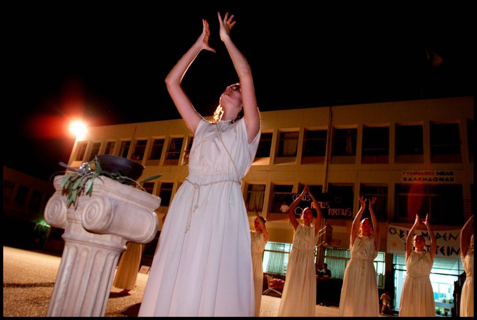 Ingen græsk arv er os nærmere i disse dage end de olympiske lege, en sportsfest opkaldt efter de øverste guders residens på Olympen, men henlagt til Olympia på Peloponnes, et helligt landskab, dengang som nu bevokset med oliventræer og i Oldtiden hjemsted for en kolossal-statue af hovedguden Zeus, i hvis tempel den hellige eller olympiske ild opbevaredes. Hvad der blev af statuen, efter sigende 12 meter høj og et af den klassiske verdens syv vidundere, vides ikke. Måske blev den efter kristendommens indførelse bragt til Konstantinopel, hvor den gik tabt under en brand i 475.