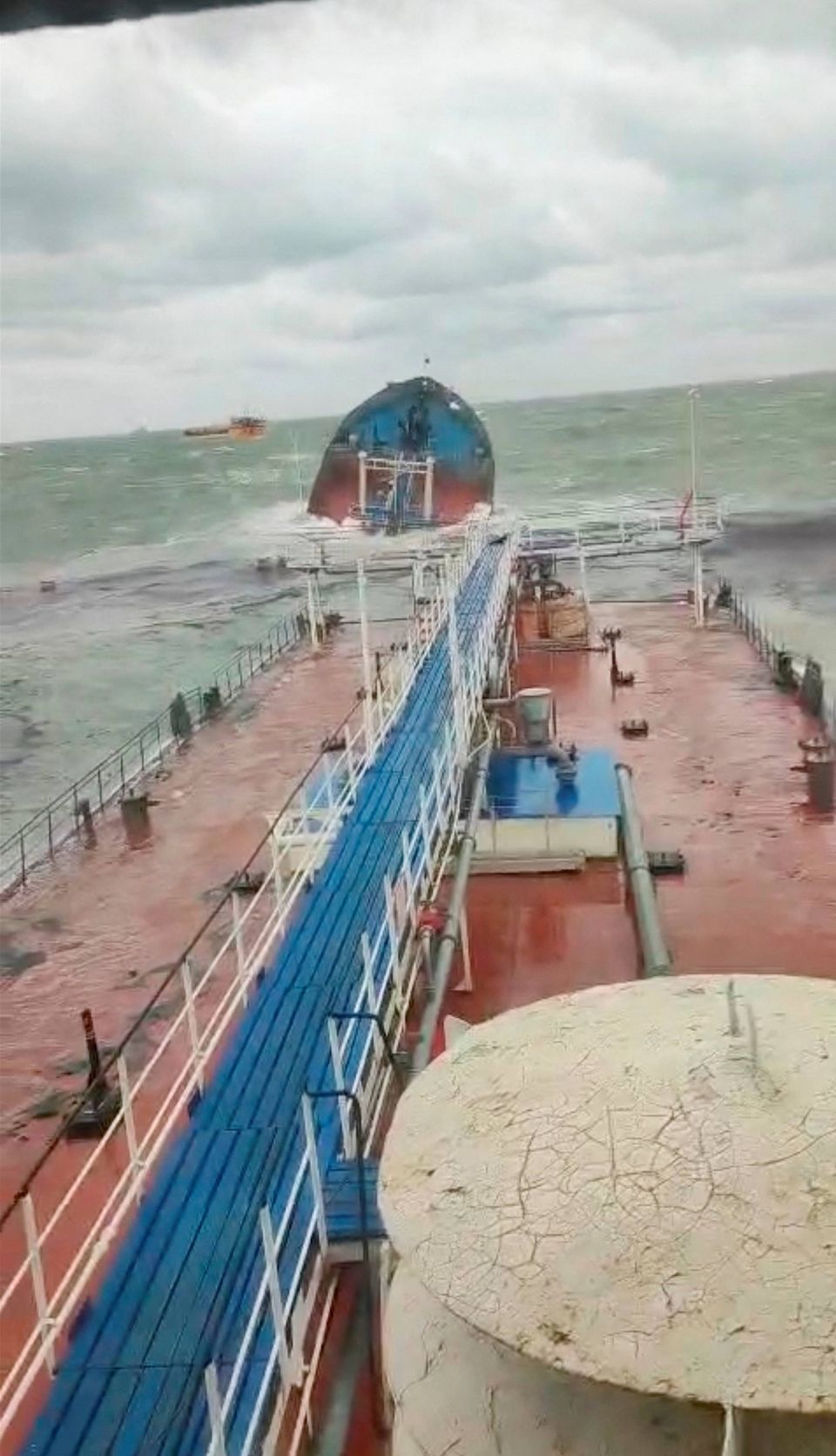 Her knækkede et over 50 år gammelt russisk tankskib, der fragtede tonsvis af olie, over under et uvejr i Kertjstrædet tæt på halvøen Krim og lækkede olie. Også et andet skib endte i havsnød.