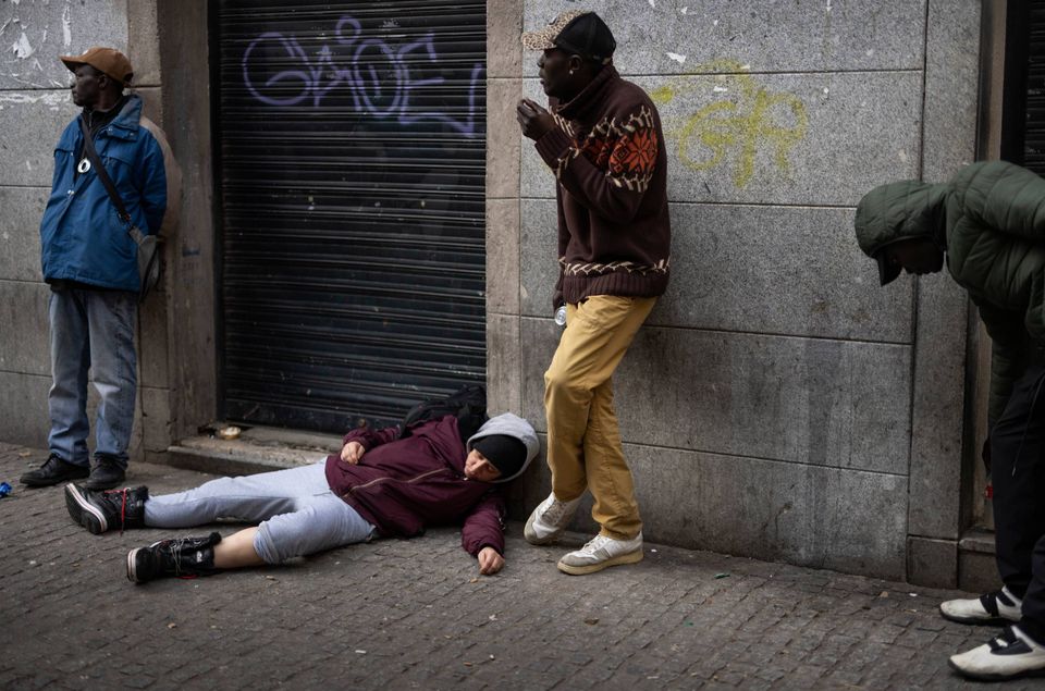 Bag os ligger en mand udstrakt på fliserne. Øjnene vendt væk, kroppen slap, helt væk på stoffer. For få minutter siden stormede politiet pladsen.