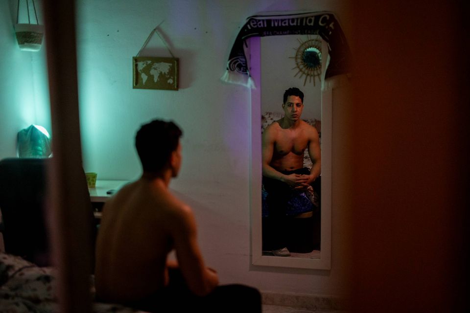 Et Real Madrid-halstørklæde hænger løst over spejlet, og marokkanske vægdekorationer kaster bløde skygger på væggene.
