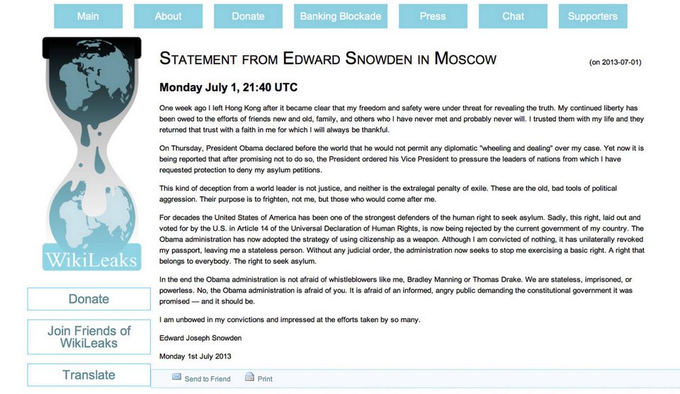 "Det er blevet rapporteret, at præsidenten - selvom han har lovet det modsatte - har beordret sin vicepræsident til at presse ledere af nationer, som jeg har søgt beskyttelse hos, til at afvise mine asylansøgninger," siger Snowden i en meddelelse offentliggjort af Wikileaks.