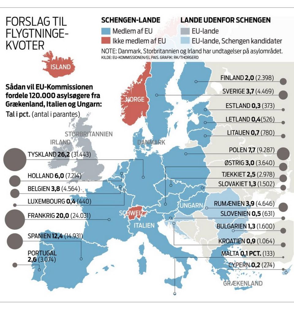 Jean-Claude Juncker, formand for EU-Kommissionen, ventes onsdag i en tale til EU-Parlamentet at fremlægge et tredelt forslag til en ny, fælles politik. Ud over at fordele 160.000 asylsøgere fra Ungarn, Grækenland og Italien til de øvrige EU-lande – heraf er der allerede enighed om at fordele 40.000 – vil Juncker trods bitter modstand fra Øst- og Centraleuropa foreslå en permanent kvoteordning, der udløses automatisk i nye krisesituationer.