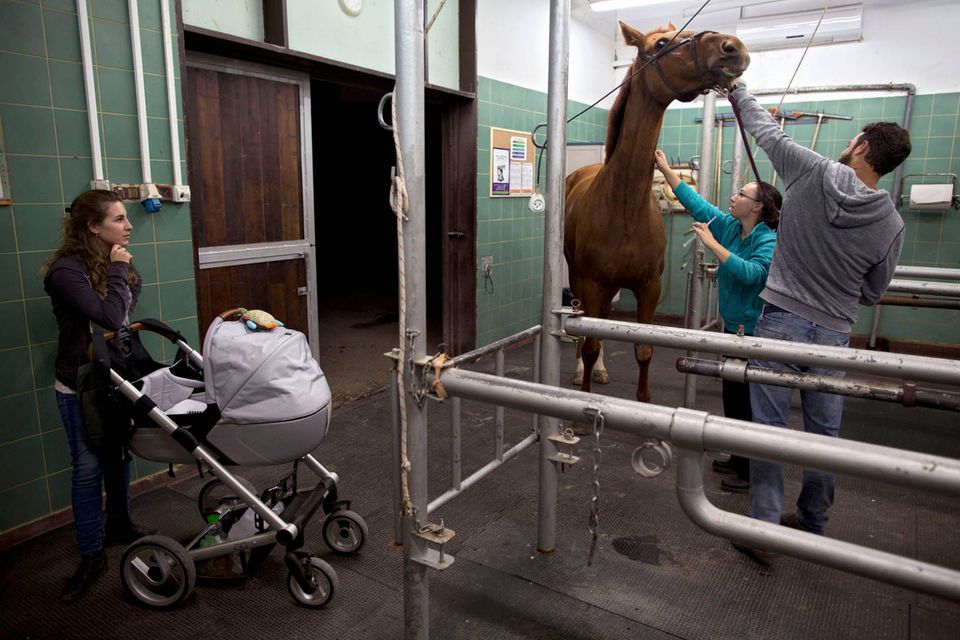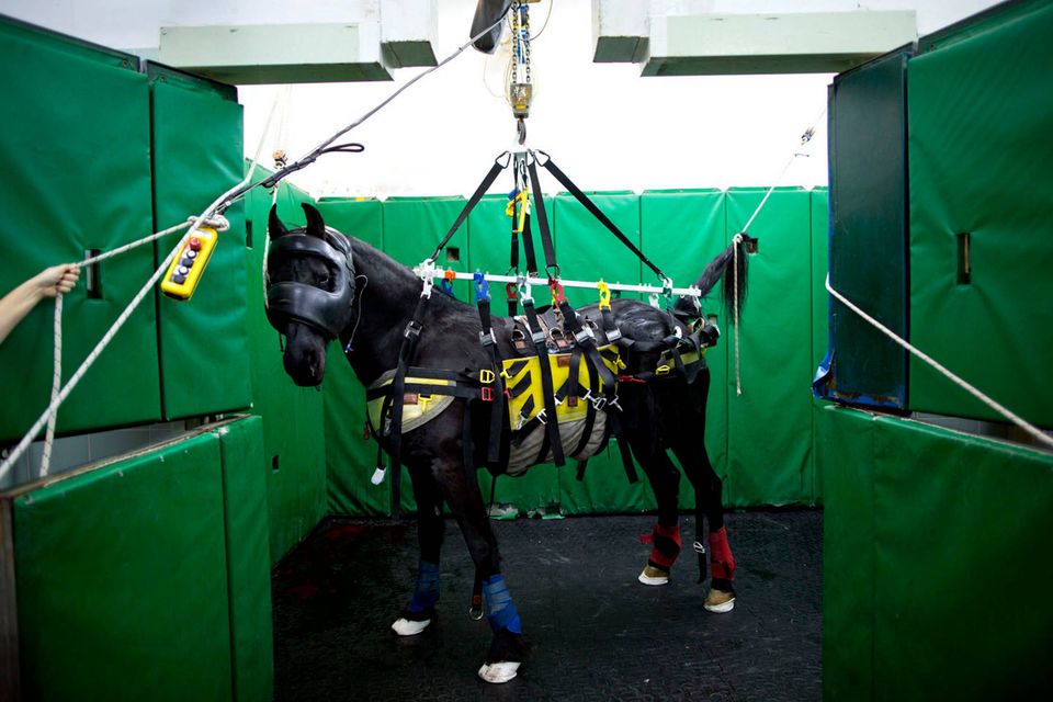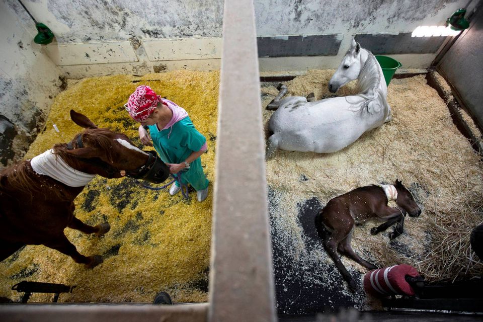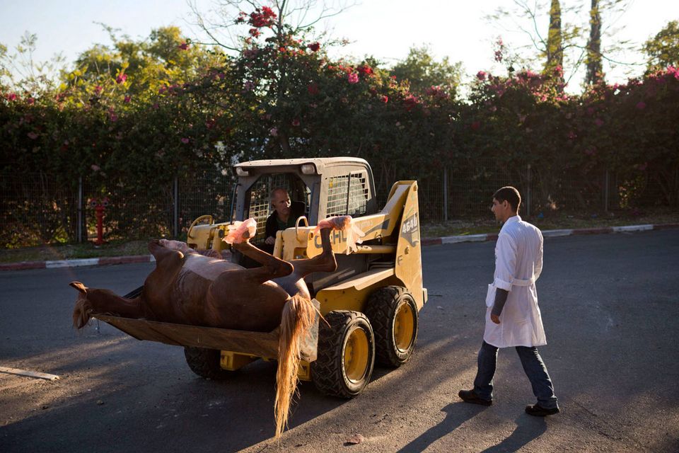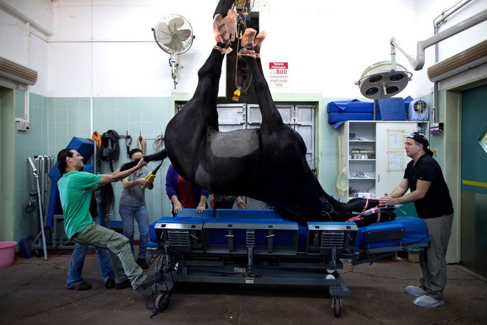 "De er ikke gode patienter," siger Dr. Gal Kelmer, der er leder af afdelingen for store dyr på Hebrew University Koret Tierärztlichen."Når det lykkedes med de stror dyr, bliver jeg glad," siger han.Dyrlægerne på hospitalet opererer på omkring to dusin heste om måneden, de fleste af dem showheste, der er kommet til skade under forstillinger eller lign. For at forberede en hest til operation, skal der ligges et drop i hestens halsvene.Heste er tilbøjelige til galop fra operationsbordet, så snart bedøvelsen aftager. Det kræver at dyrlægerne kan stole på udstyret og de mange frivillige, der deltager i håndteringen af de knap 500 kg tunge dyr."Heste har et instinkt der gør de flygter," fortæller Kelmer. "I det øjeblik de vågner, begynder de at prøve på at komme op på benene, også selvom de ikke har kontrol over deres lemmer, og så de falder."For at begrænse en flyvsk hest, kommer Kelmer dyret ind i en slynge, som støtter den fra maven og løfter den op i luften.Den mest almindelige medicinske problem er kolik - en mave lidelse, der normalt kræver hejsning hesten på hovedet for at undersøge maven. Andre omfatter traumer, frakturer på ben og vejrtrækningsproblemer."Nogle gange bliver jeg spurgt, om det kun er heste jeg opererer - og til det må jeg sige at det er meget alsidigt" fortæller Kelmer "I dag har jeg behandlet et øje, en hest med en skadet ben, og en endetarmen. Det er mere end et almindeligt menneske får lavet på et helt liv"En hest og hendes én dag gammle føl hviler i en fold, men anden hest modtager behandling på Hebrew University Koret Tierärztlichen i Rishon Lezion, IsraelDr. Gal Kelmer, leder af afdelingen for store dyr, løsner en hest efter opvågningen.En af hestene overlevede ikke operationen og bliver kørt væk fra hospitalet.