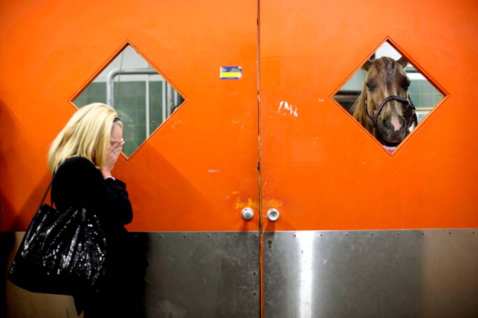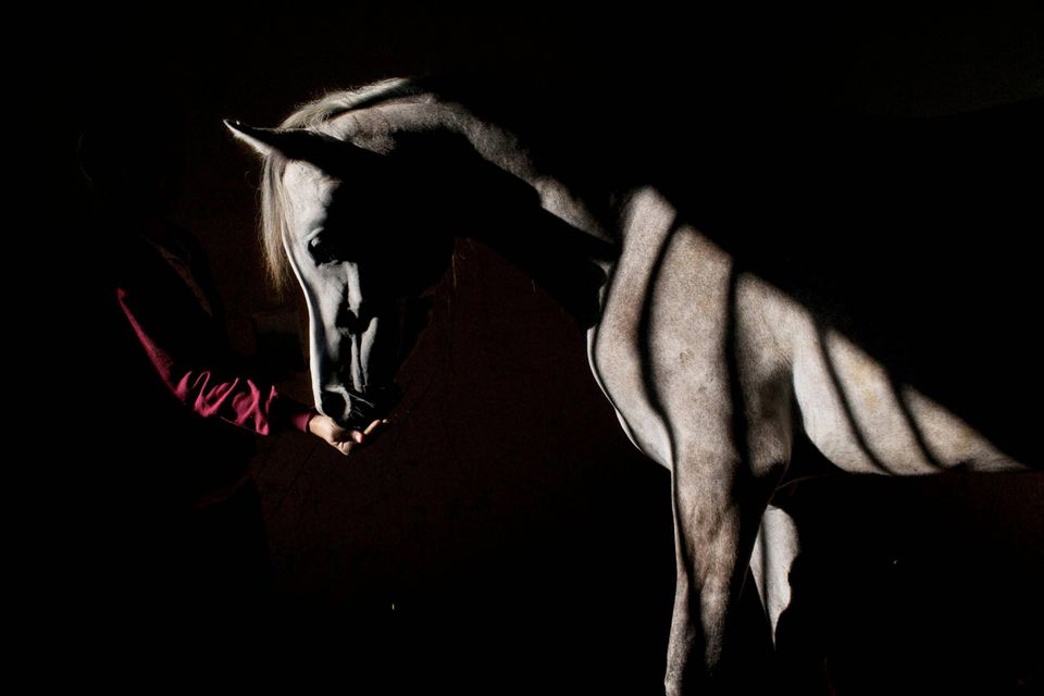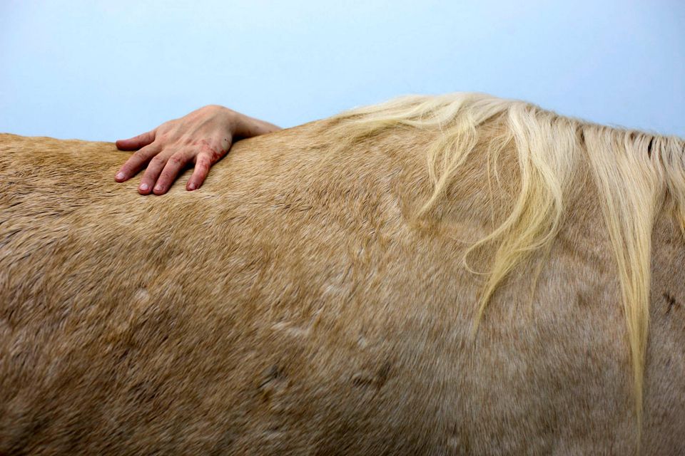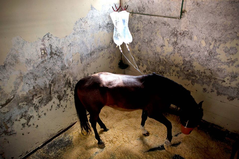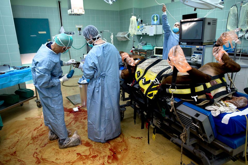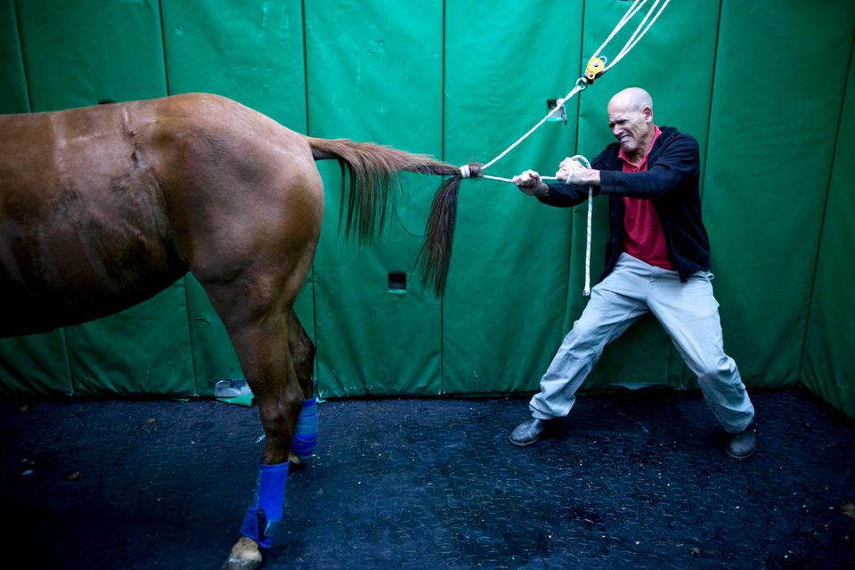 "De er ikke gode patienter," siger Dr. Gal Kelmer, der er leder af afdelingen for store dyr på Hebrew University Koret Tierärztlichen."Når det lykkedes med de stror dyr, bliver jeg glad," siger han.Dyrlægerne på hospitalet opererer på omkring to dusin heste om måneden, de fleste af dem showheste, der er kommet til skade under forstillinger eller lign. For at forberede en hest til operation, skal der ligges et drop i hestens halsvene.Heste er tilbøjelige til galop fra operationsbordet, så snart bedøvelsen aftager. Det kræver at dyrlægerne kan stole på udstyret og de mange frivillige, der deltager i håndteringen af de knap 500 kg tunge dyr."Heste har et instinkt der gør de flygter," fortæller Kelmer. "I det øjeblik de vågner, begynder de at prøve på at komme op på benene, også selvom de ikke har kontrol over deres lemmer, og så de falder."For at begrænse en flyvsk hest, kommer Kelmer dyret ind i en slynge, som støtter den fra maven og løfter den op i luften.Den mest almindelige medicinske problem er kolik - en mave lidelse, der normalt kræver hejsning hesten på hovedet for at undersøge maven. Andre omfatter traumer, frakturer på ben og vejrtrækningsproblemer."Nogle gange bliver jeg spurgt, om det kun er heste jeg opererer - og til det må jeg sige at det er meget alsidigt" fortæller Kelmer "I dag har jeg behandlet et øje, en hest med en skadet ben, og en endetarmen. Det er mere end et almindeligt menneske får lavet på et helt liv"En hest og hendes én dag gammle føl hviler i en fold, men anden hest modtager behandling på Hebrew University Koret Tierärztlichen i Rishon Lezion, IsraelDr. Gal Kelmer, leder af afdelingen for store dyr, løsner en hest efter opvågningen.En af hestene overlevede ikke operationen og bliver kørt væk fra hospitalet.