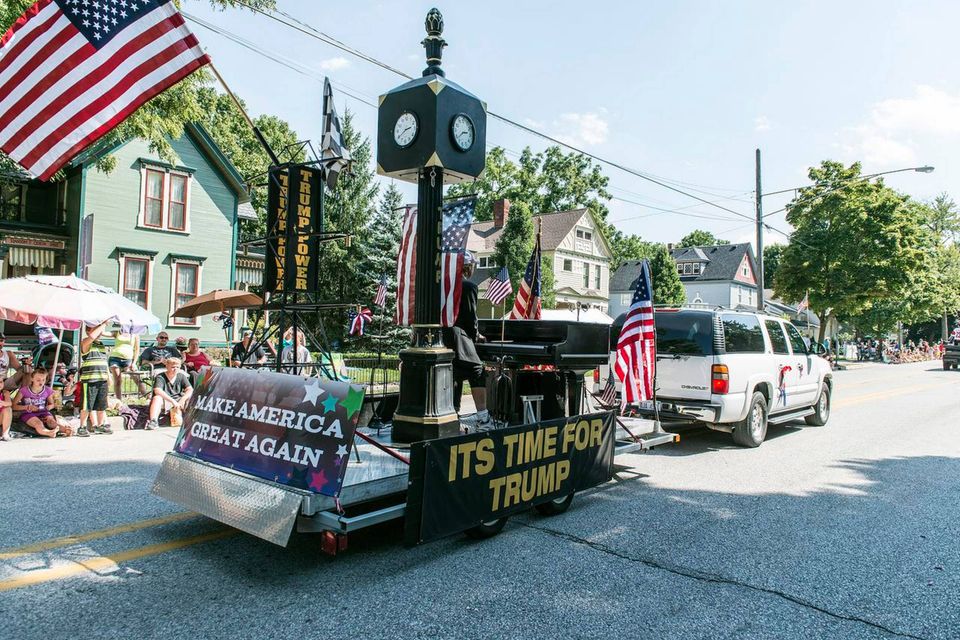 »It’s time for Trump« læser vi med gule bogstaver på et sort skilt på Ellis’ anhænger, mens vi tygger os en diabetes til i de spandevis af bolsjer og karameller, som paradedeltagerne kaster ud til tilskuerne i magelige campingstole.