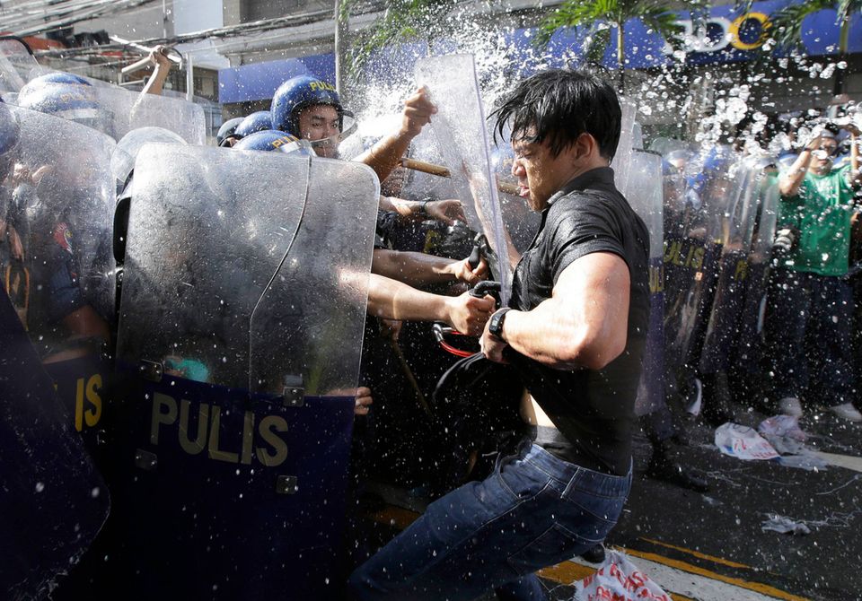 Få timer før den amerikanske præsident, Donald Trump, søndag ankom til et topmøde i Filippinerne, kæmpede politiet og demonstranter i gaderne i hovedstaden Manila.