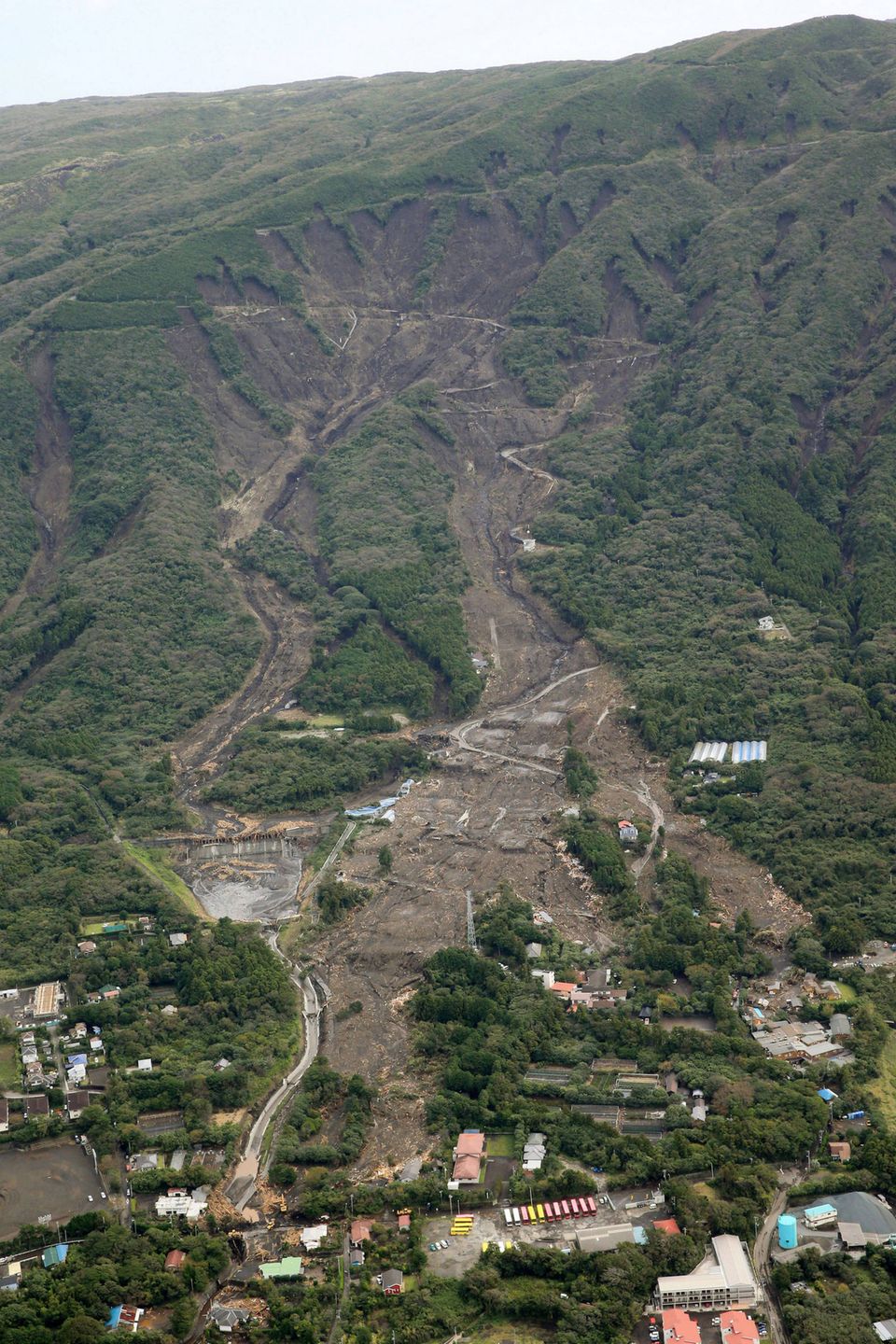 Der faldt over 80 centimeter regn fra tirsdag morgen til onsdag morgen på øen, hvor en af Japans største vulkaner ligger, og de enorme regnmængder gjorde bjergsiderne på øen ustabile.